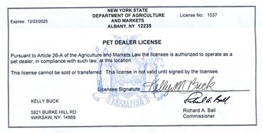 Buck Family Farm puppies are AKC registered, vet certified, have first shots, are wormed and will come to your home with a 1 year health guarantee and a first bag of puppy food. We also send a blanket with mommy's scent and all appropriate NYS paperwork as well as copies of parents' health clearances. Our desire is to make your experience with us and our puppies everything you expected and more.