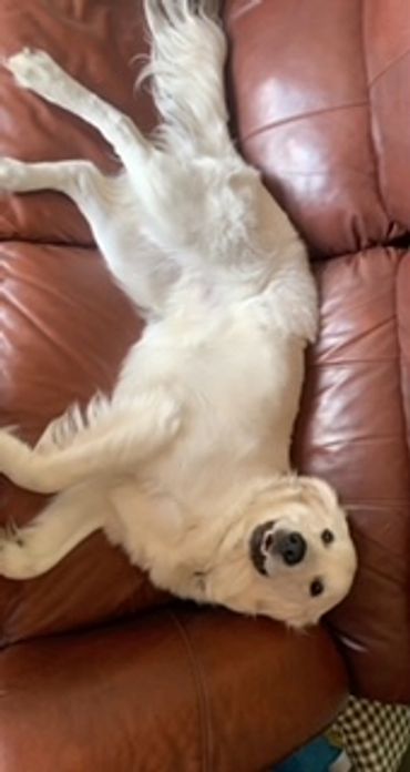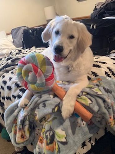 Hi there. This is Jesi .I just wanted to thank you so much for our puppy. Leonardo DaPotato is doing really well. He has been doing well with some of the at home training to become my daughter's service animal. He has been such a blessing. He already is warning her about disassociation attacks and he gives her pressure and very gentle nibbles to help her come out of them. We never even had to teach him more than "help mom" command. My daughter's anxiety has severely decreased and her disassociation attacks are less frequent and shorter in duration. We couldn't have asked for a better dog. Here is a picture of him in his big boy dog bed that my MIL bought him. He keeps out growing the ones we bought so a full size golden retriever bed was just what he needed. Thank you thank you thank you....and your family for breeding such great puppies.