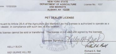 Buck Family Farm puppies are AKC registered, vet certified, have first shots, are wormed and will come to your home with a 1 year health guarantee and a first bag of puppy food. We also send a blanket with mommy's scent and all appropriate NYS paperwork as well as copies of parents' health clearances. Our desire is to make your experience with us and our puppies everything you expected and more.